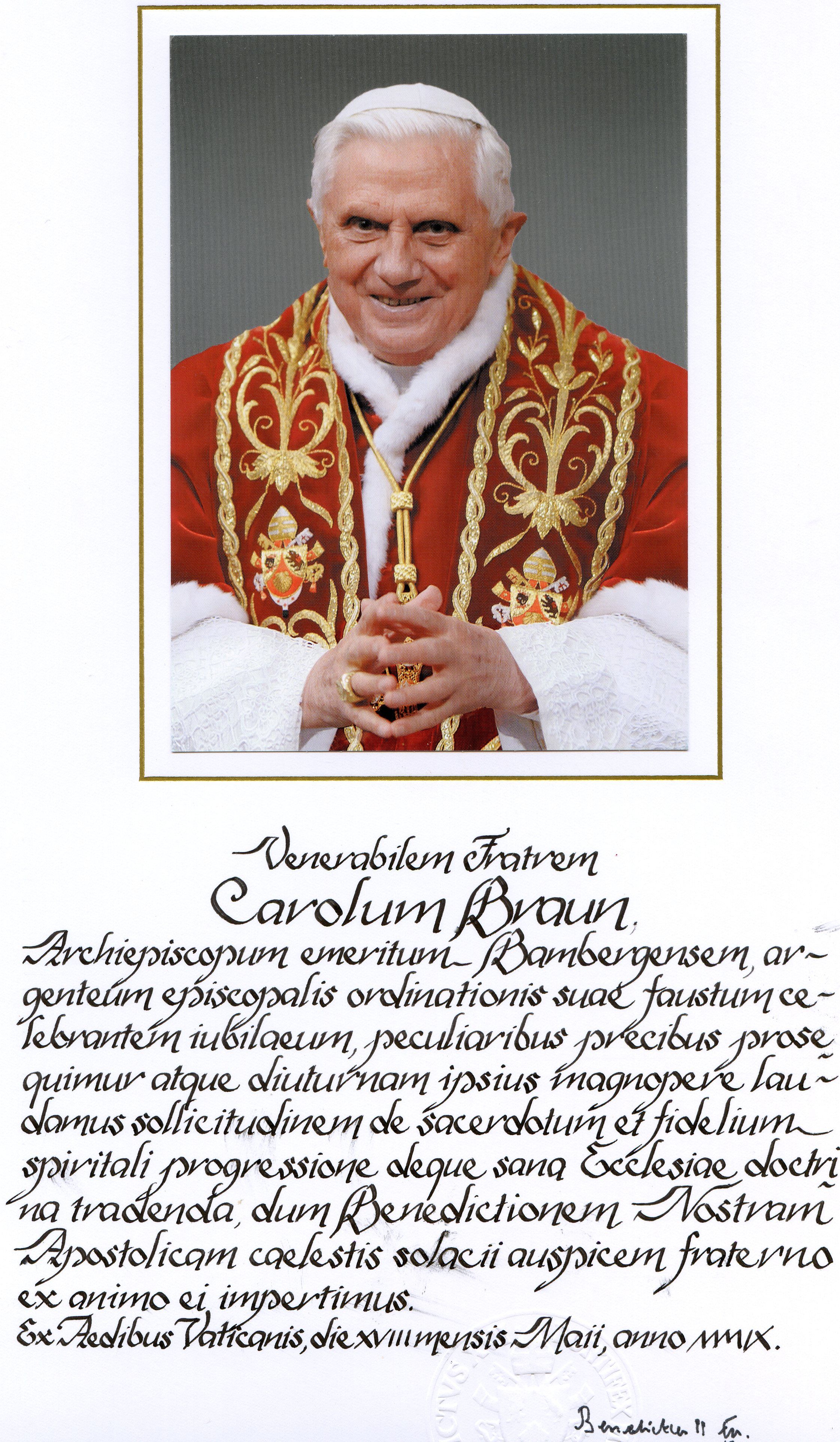 Raimund Josef H. hat geschrieben:Erzbischof em. Dr. Karl Braun wurde vor 25 Jahren zum Bischof geweiht. Das Jubiläum wird mit einem Festgottesdienst im Bamberger Dom und anschliessenden Festakt am 20. Juni gefeiert.