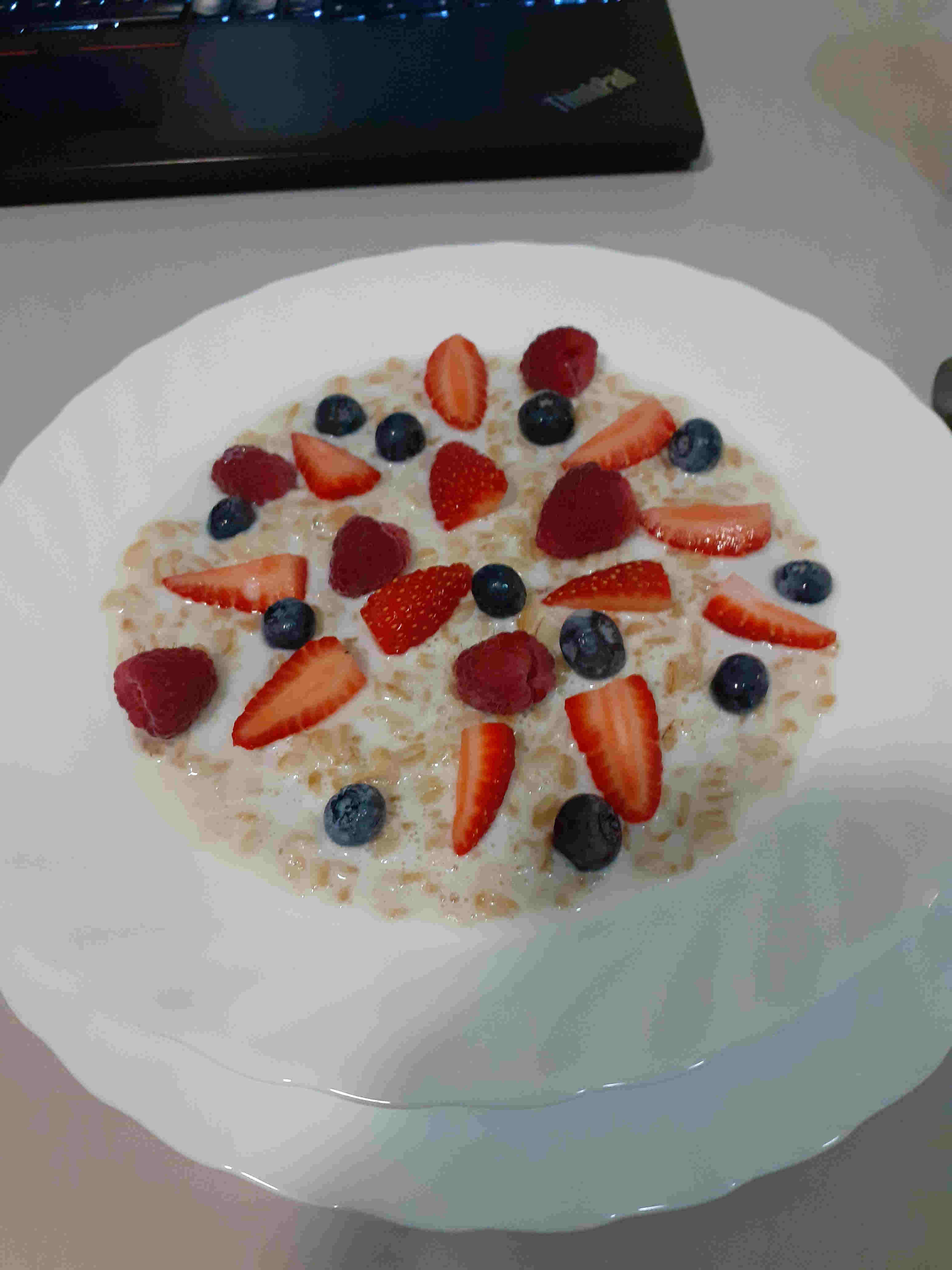 So sieht mein Frühstück im Moment meistens aus: Hafer-Kascha mit Beeren und kleingehackten Mandeln; Blaubeeren sind mittlerweile alle, aber Himbeeren und Erdbeeren habe ich am Sonntag noch bei einer alten Frau am Straßenrand kaufen können.