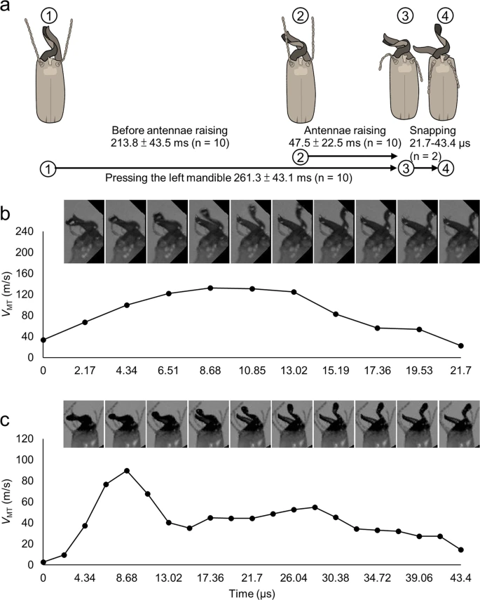 Wir reden hier von dem schnellsten Tier der Welt, jedenfalls wenn man über die Geschwindigkeit von Körperteilen redet. Soldaten der Termite Pericapritermes nitobei haben eine asymmetrisches Mandibel, daß sie benutzen um Feinde (z.B. Ameisen) per Schlag zu zertrümmern.