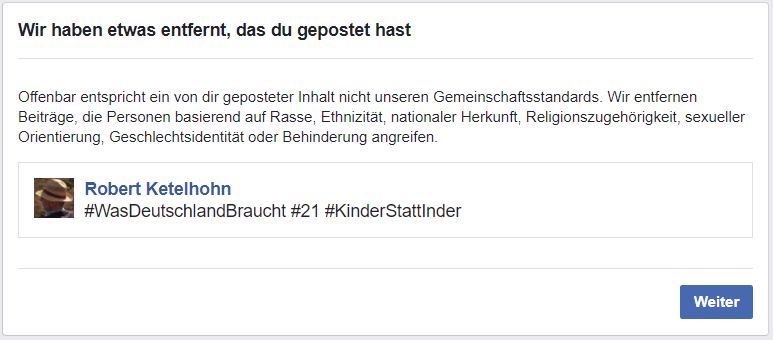 Robert Ketelhohn hat geschrieben: ↑Freitag 2. Februar 2018, 08:18Ist es möglich, darauf zu reagieren?Robert Ketelhohn hat geschrieben: ↑Donnerstag 1. Februar 2018, 13:07Ich bitte darum, auf meiner Facebook-Seite: https://www.facebook.com/robert.ketelhohn unter Hinweis auf die referenzierten Beiträge auf VKontakte und Twitter den Lesern mitzuteilen, daß ich wiederum gesperrt worden bin.