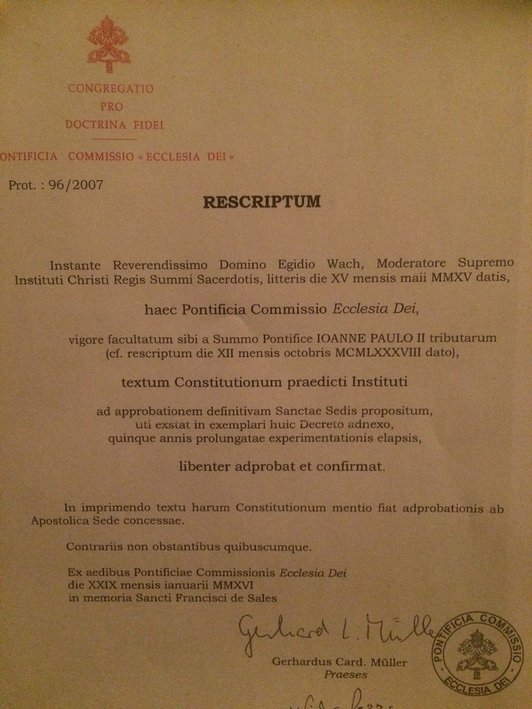 On this 29th of January, feast of St. Francis de Sales in the 1962 Missal, the Institute of Christ the King Sovereign Priest has received the definitive approval of its Constitutions from the Pontifical Commission Ecclesia Dei.
